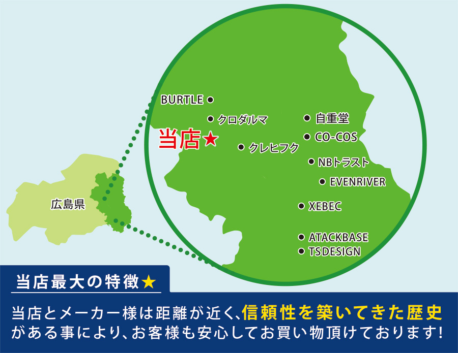 お店のある広島県東部(備後地域)は、古くから織物業が盛んな地域で、特に作業服は、国内出荷量の過半数をしめる全国でも有数のブランドメーカーが多く点在しています。また運営する(株)朝日倉庫は、創業90年のアパレルの保管・流通加工などを行っており、各メーカー様の多くの商品を全国に向けて日々配送しています。